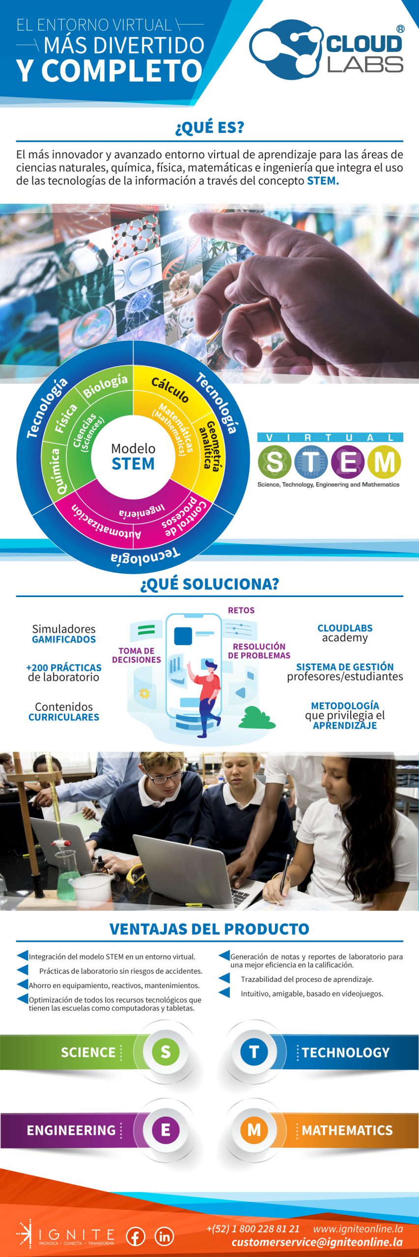 El modelo STEM (Sciences, Technology, Engineering, Mathematics) compuesto por simuladores gamificados permiten realizar más de 200 prácticas de laboratorio, contenidos curriculares que soportan las prácticas, un sistema de gestión para los profesores y estudiantes, una comunidad de docentes, CloudLabs Academy y el uso de una metodología que privilegia el aprendizaje basado en retos, la toma de decisiones y la resolución de problemas.